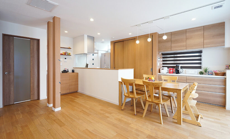 キッチンカウンターや収納スペースを設けていないため、ダイニングテーブルをぴったりと付けることができ、床面を多く見せることで広々とした空間を演出しています。