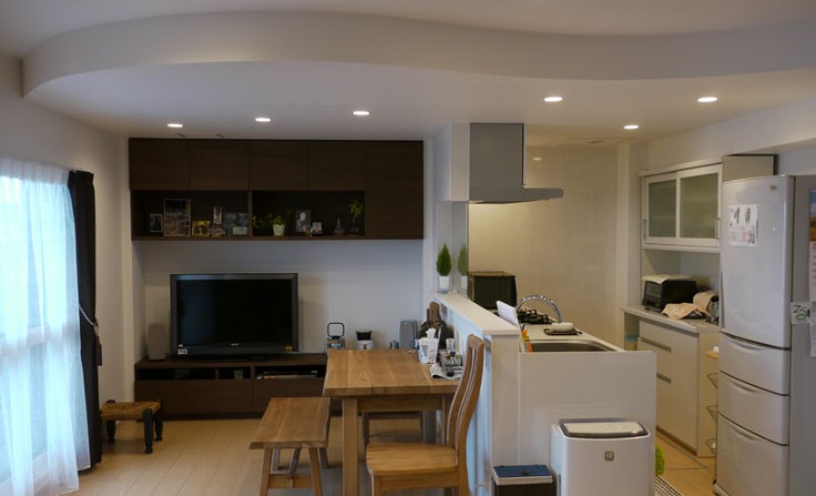 間取り変更のほか、LDKの下がり天井に梁型を造作して間接照明を設置し、ゆったりと過ごせるデザインの空間が完成しました。