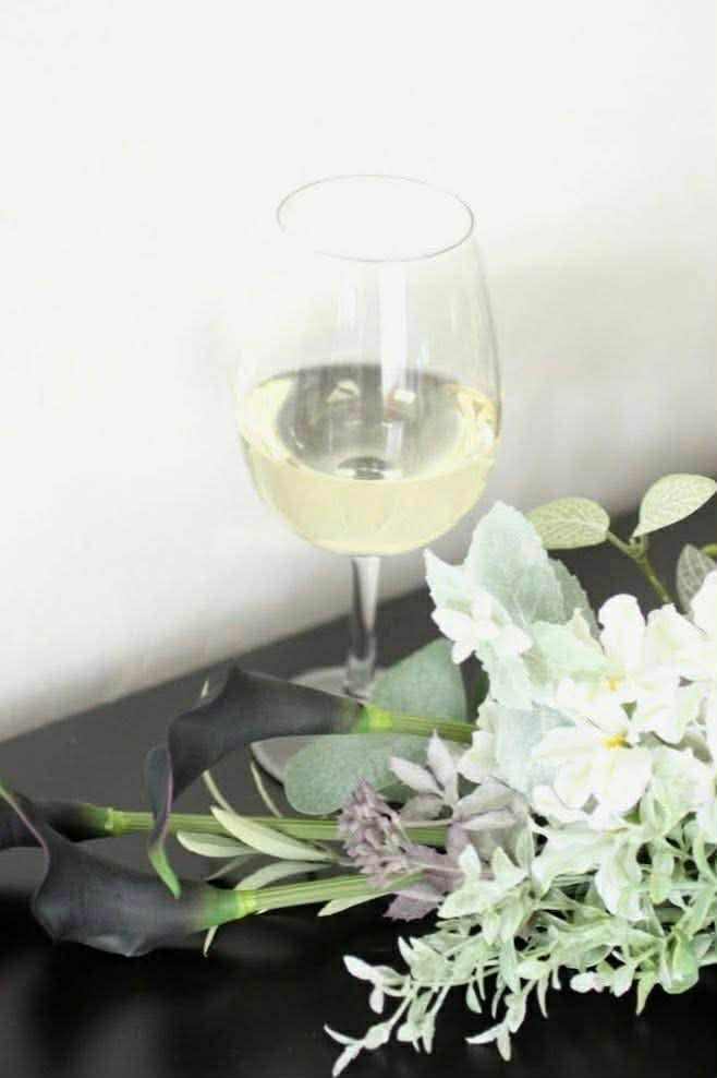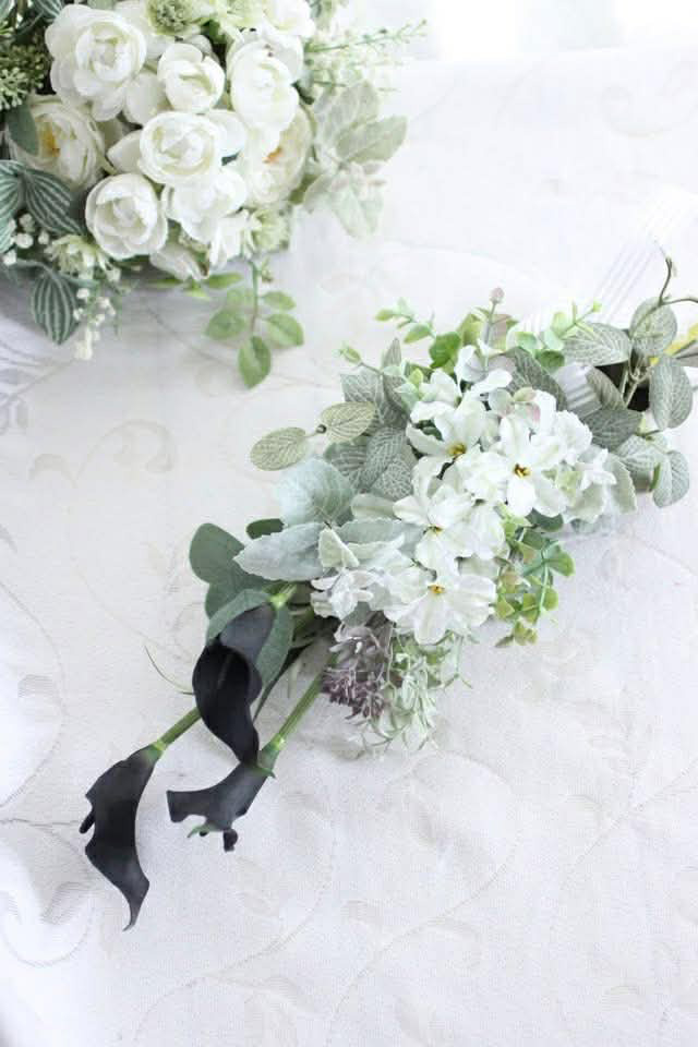 たっぷりのグリーンと白いリューココリネ、黒のカラーでラインを効かせた、ナチュラルモダンでスタイリッシュなスワッグを制作します。今回は”緑のワイン”を片手に^^