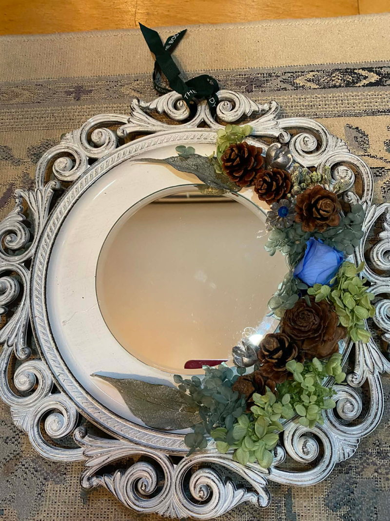 プリザーブドフラワーや木の実で飾った壁掛け鏡をご自分で作ったみませんか?