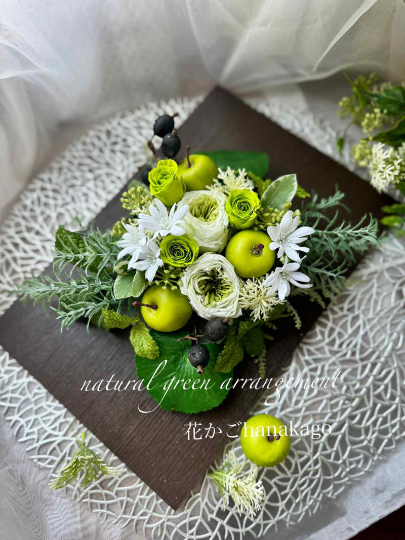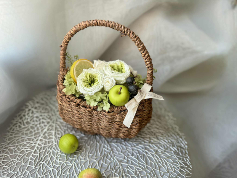 • 特徴: 瑞々しいフルーツをあしらった、遊び心あふれるカゴアレンジ。持ち手付きなので、リビングやキッチン、玄関など、その日の気分で手軽に移動させて楽しめます。