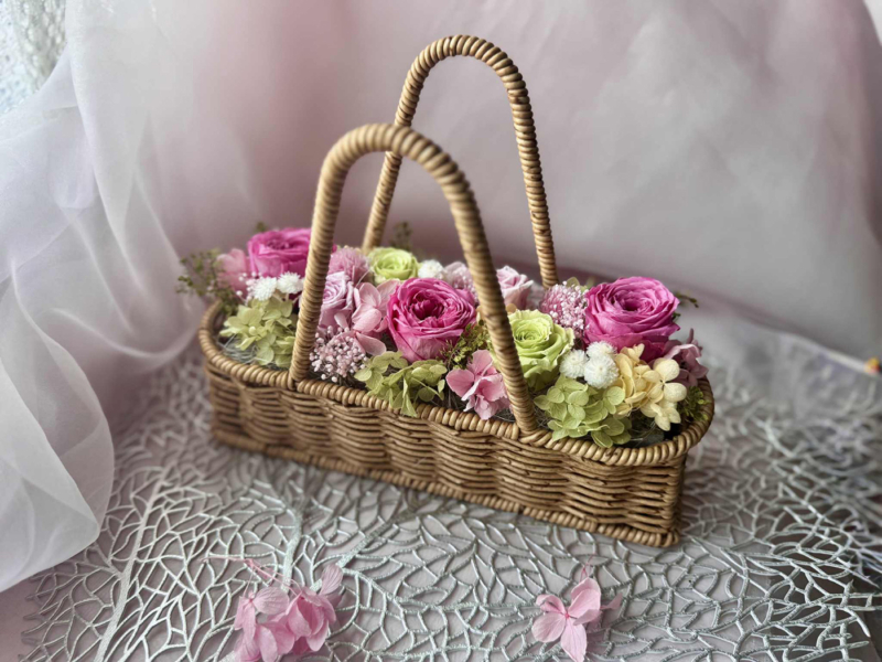 • 特徴: パステルカラーのバラを贅沢に使い、春のお花畑をイメージ。大人可愛らしく、置くだけでお部屋がパッと明るい雰囲気に包まれます。