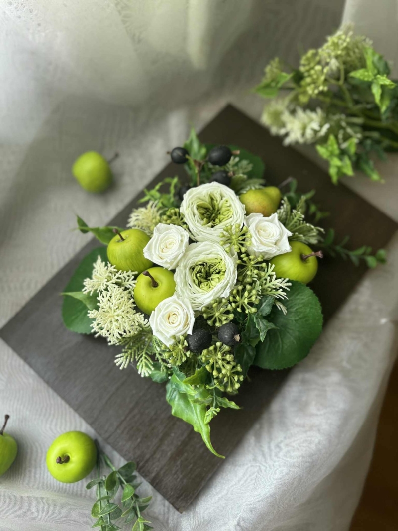 みずみずしいグリーンアップルと、気品あふれる白バラ。