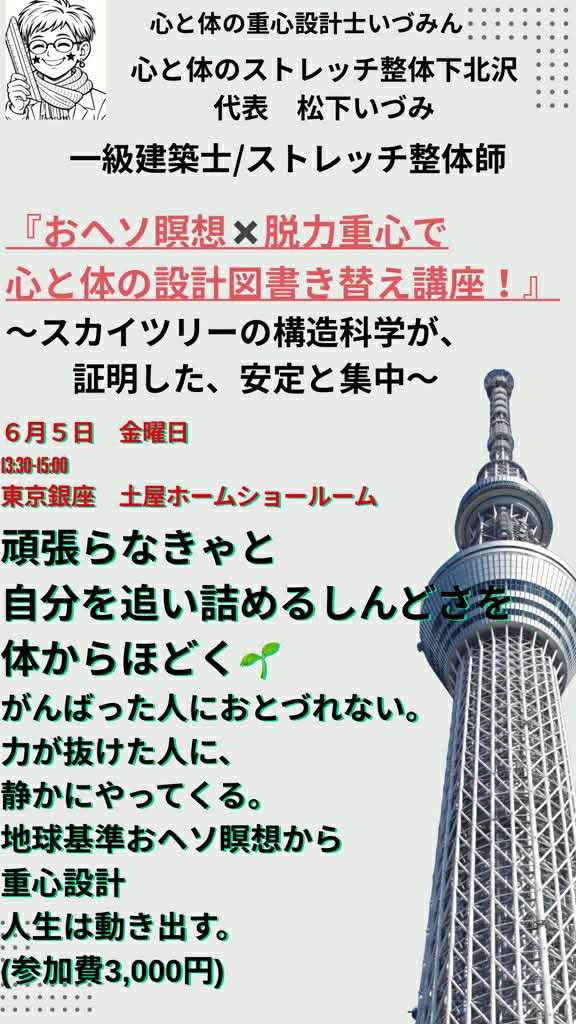 [銀座] 頑張らなきゃと自分を追い詰めてしまう。そのしんどさを体からほどく!。 スカイツリーの構造科学から生まれた『おヘソ瞑想・脱力重心』 予約制