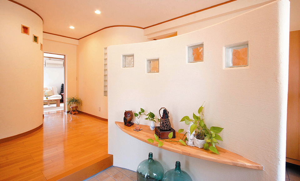 お客様から収納が見えない高さで下駄箱設置。曲線を使った壁で疲れを癒す玄関ホール。