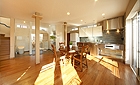 リビングを明るくし、ウッドデッキを眺めるようにしました。その奥は落ち着いた雰囲気のダイニングにしています。キッチンも広く改修しました。壁厚の有効利用して飾り棚を造作しました。