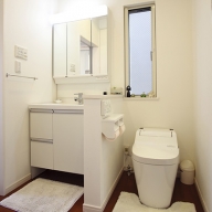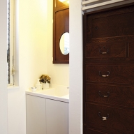 百年前の祖母の箪笥をはめ込むスペースを設置。洗面の鏡にも思い出の家具の建具を再利用。