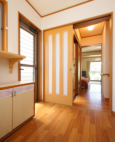 縁側・廊下をつぶして寝室の収納として、動線を改善。出入り口から、トイレが見える距離に。