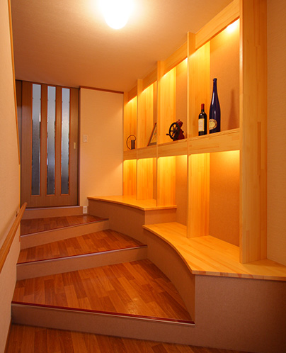 Rにした階段に途中腰掛けられる位のベンチと、飾り棚を造作する事で柔らかな印象。