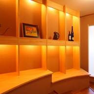 階段ホールに面する家事室に大きな明かりとりを作り、飾り棚を設置することで、変化のある空間に仕上げました。動線の改善をおこない、階段の踏み面も大きく傾斜をゆるくすることで、水周りの使いやすさと安全を確保、母屋との行き来をしやすいようにしました。家事室を設置することで、冬季間の洗濯物を干すスペースを確保するだけでなく、介助が必要になった際は車椅子の旋回スペースとして利用。地震、介助に対する安全と安心、エコキュート導入と断熱性向上によって快適性と環境面の両立。
