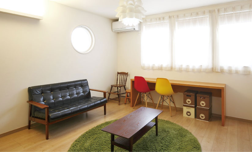 リビングには、家族みんなで使える多目的カウンターを設置。丸窓がいいアクセント。