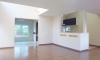 両方の家に挟まれて日がさしこまないので、キッチン上に天窓、居間には吹き抜けを設けて家全体を明るくしています。
