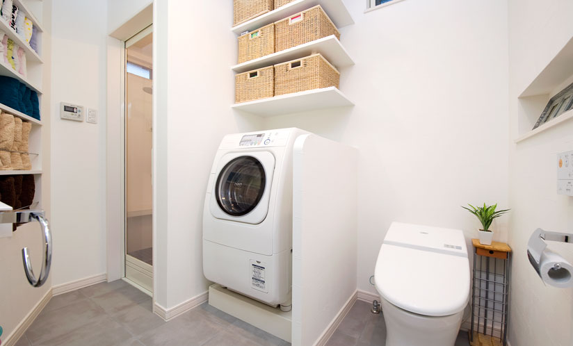 洗面室とトイレをワンルームに。 部分壁で仕切って洗濯機もすっきり収め、上に棚を設けて洗濯類もきれいに収納。コンパクトなスペースながら、狭さを感じさせない空間に 。 右手奥はシャワールームで、ベンチに腰掛けることもできる。