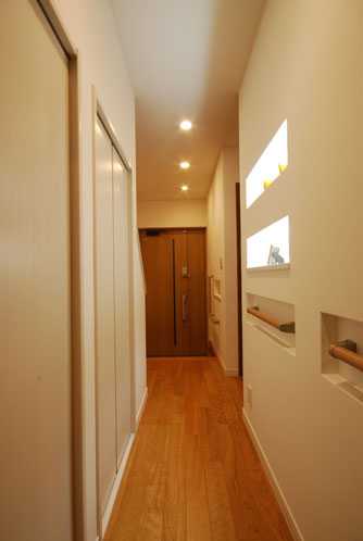 廊下に手摺が邪魔にならないように壁を掘り込んで設置。