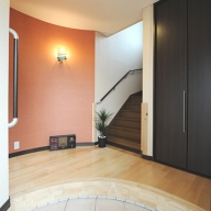 ○玄関ホールを縮小した分、Rの壁と框で視覚的な狭さを解消オレンジのクロスでアクセント