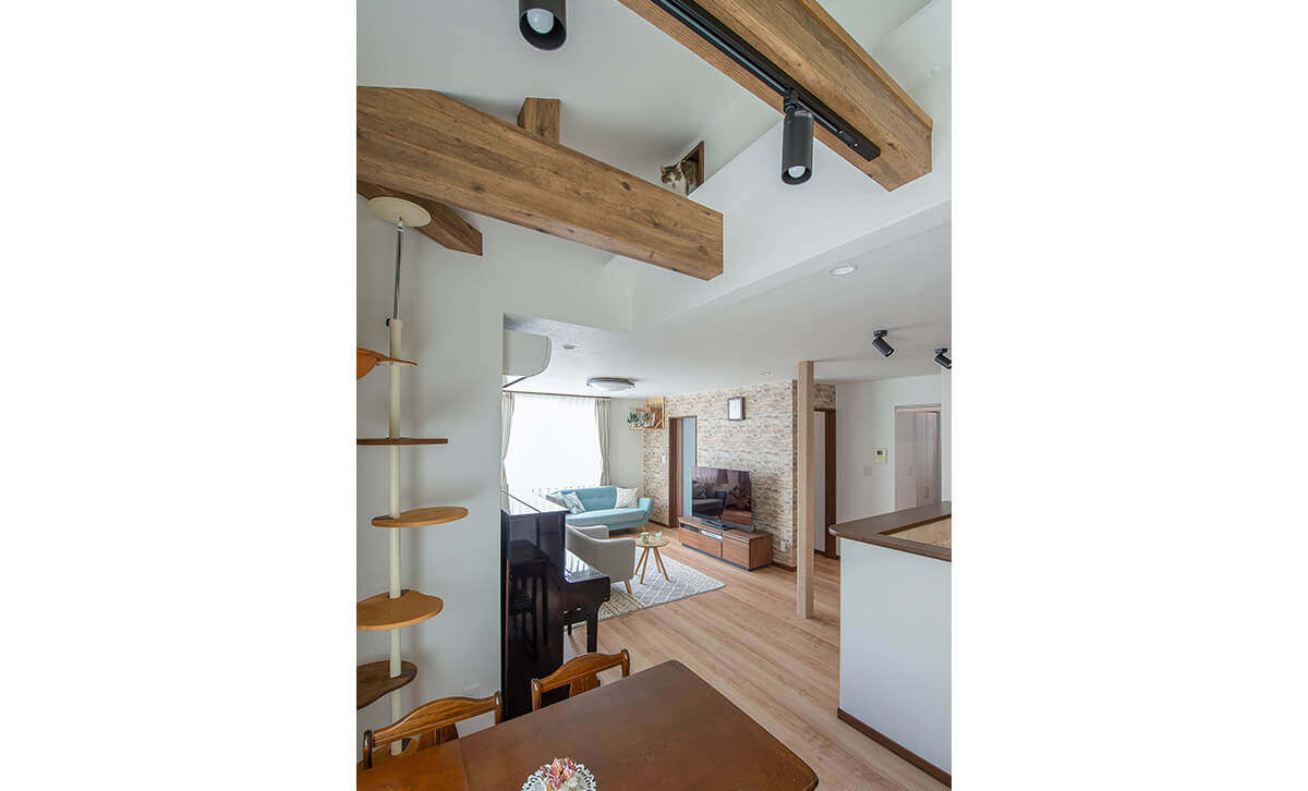 ・屋根断熱を施工した吹上天井で猫達も上下自由に行き来できる空間にする。