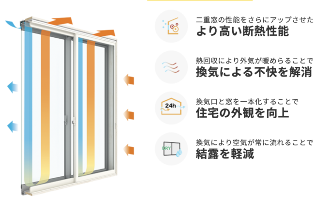 二重窓内で熱交換することでお部屋の温度を変えず換気できる最新の窓で換気する方法となります。窓横の換気口から空気を取り込み、ガラス越しに室温を伝え、室温に近い温度で内窓側のガラリより新鮮な空気を取り入れます。