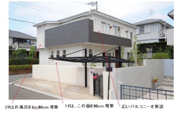 事例は、1階の道路側のリビングを増築と2階のお風呂を増築しました。