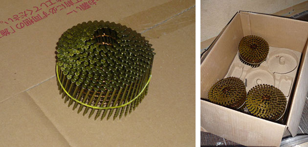 初めて見るこの巻いてある釘、調べたところ平形巻きワイヤー連結鉄釘・・・・難しい名前・・・。