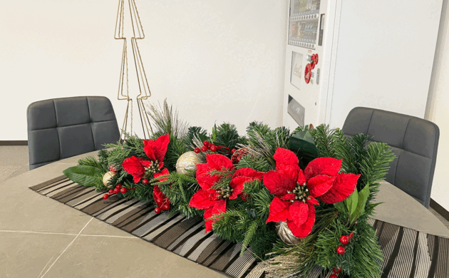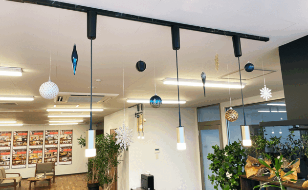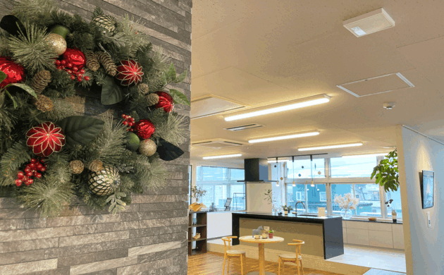 2階のショールームには、中央の柱にメインのクリスマスリースを飾り、ショールーム内のあちらこちらにクリスマスらしいオブジェを散りばめて空間を演出しています。