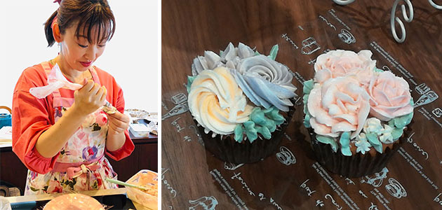 先生のデモンストレーションのあとは、1人2個ずつのカップケーキにそれぞれバラのお花を絞っていきます。