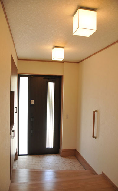 玄関は共有にしたため、広めになっています。段差が大きかったので広めの階段を
