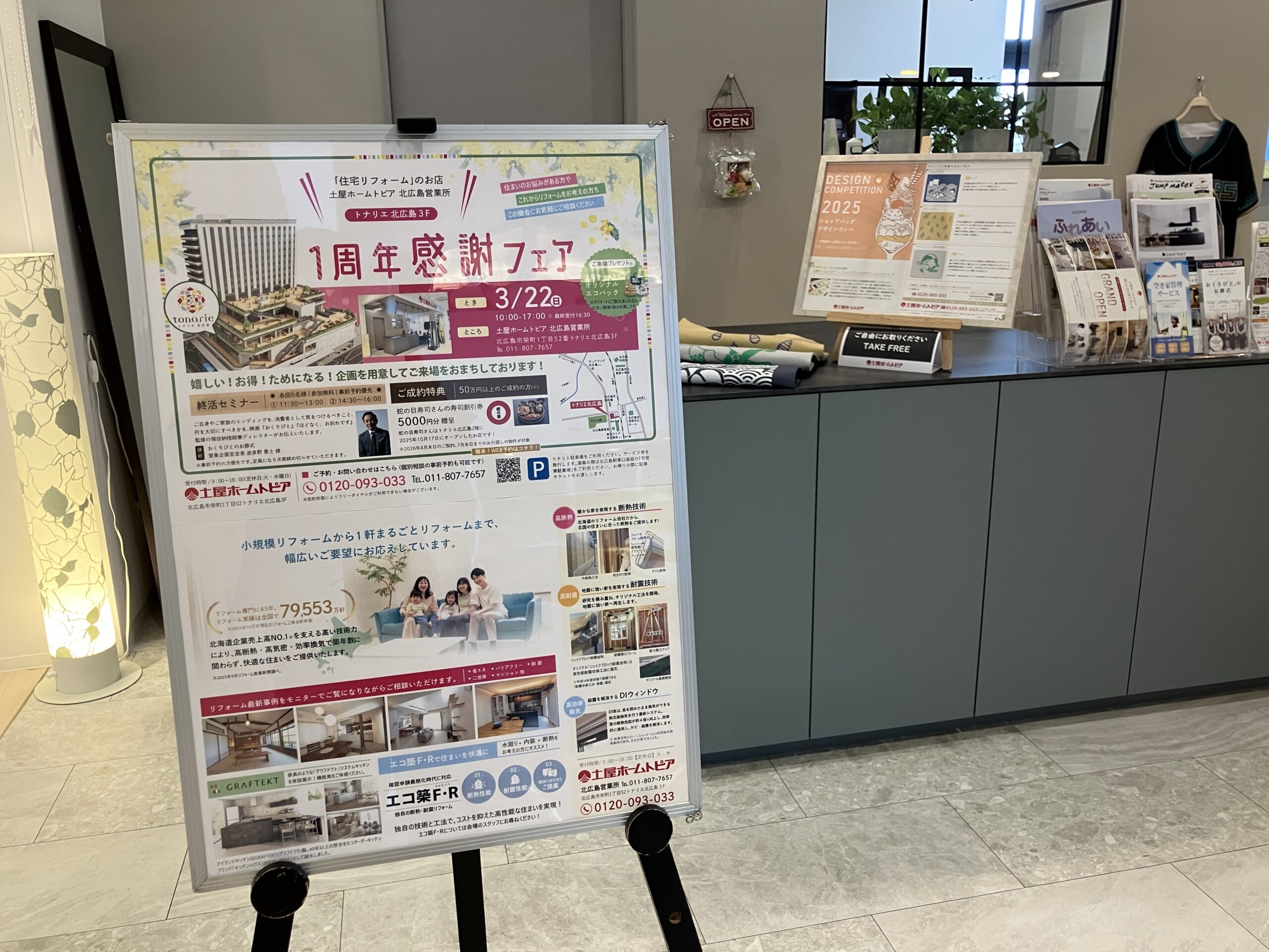 北広島営業所は、トナリエ北広島3階に昨年3月に移転・リニューアルオープンし、おかげさまでこの春、1周年を迎えることができました。