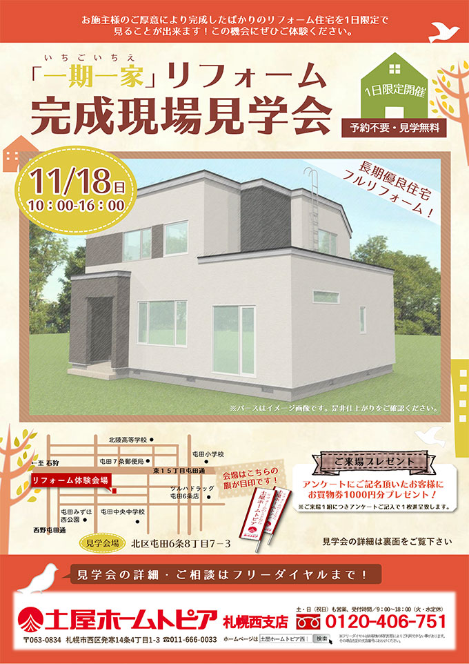 イベントのチラシや、リフォームのご相談を土屋ホームトピア 札幌西支店にて承っておりますので、お気軽にご来店ください。