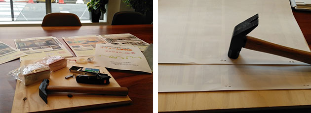 金槌があるのは、ホッチキス止めの針を潰すためです。