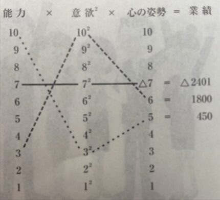 (業績=能力×意欲の2乗×心の姿勢だが、業績=使命感営業であり、心の姿勢(企業姿勢)がマイナスなら全てがマイナスになってしまうということ)