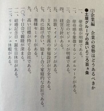 (当時の「土屋グループの良いところ百ヵ条」、皆んなで考えたものだ。今ないものには✖️、疑問なのは▲、変更は→とした。皆さん自ら付け足したり、判定をつけてみてほしい)
