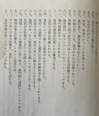 (当時の「土屋グループの良いところ百ヵ条」、皆んなで考えたものだ。今ないものには✖️、疑問なのは▲、変更は→とした。皆さん自ら付け足したり、判定をつけてみてほしい)