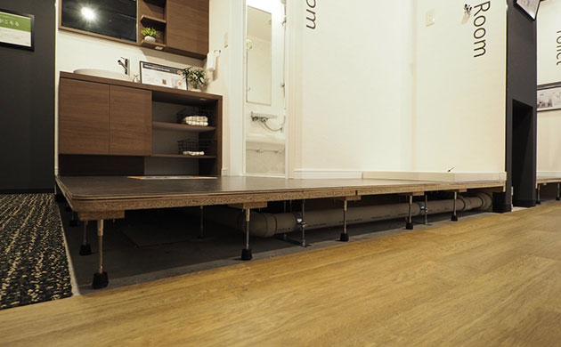 廊下と同じ高さに配管されている場合は、写真のように廊下より床が上がってしまいます。