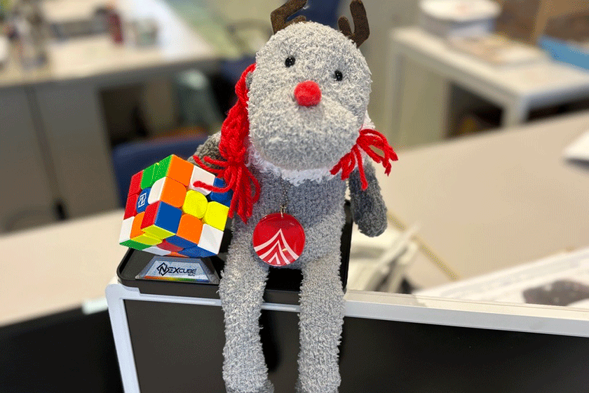 このトナカイのぬいぐるみは、Xmasの時期に設計担当の折笠が、もこもこ靴下を使って手作り したもので、社内では親しみを込めて「ぽたくん」と呼ばれています。