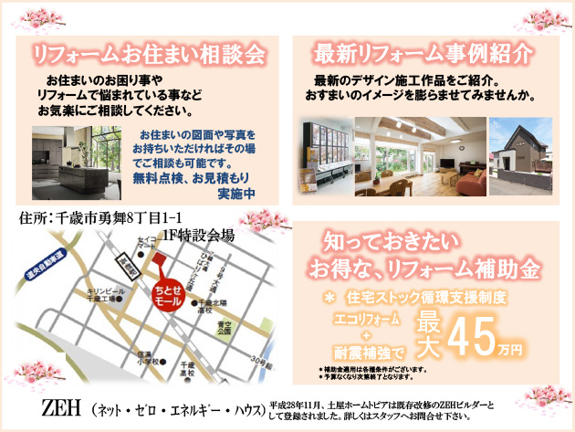 4月8日(土)9日(日)AM10時からPM5時まで、千歳モール「 千歳市勇舞8丁目1-1特設会場 」にて、暮らしの相談会を行います。