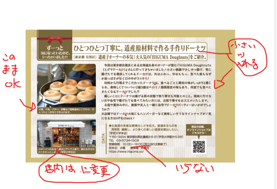 候補が決まると担当から掲載させていただく店舗や会社様に御連絡、交渉の後、承諾をいただけた後は掲載情報をおまとめした記事を確認していただく作業や、掲載写真のデータなどを頂くなど何度もやり取りをさせていただき、さらに当社の文言チェック担当の方に最終チェックをしていただきます。